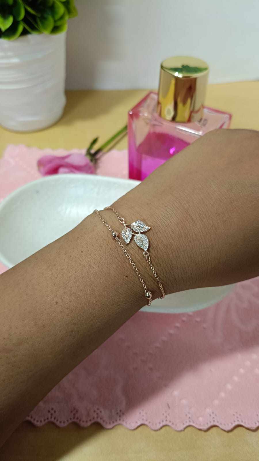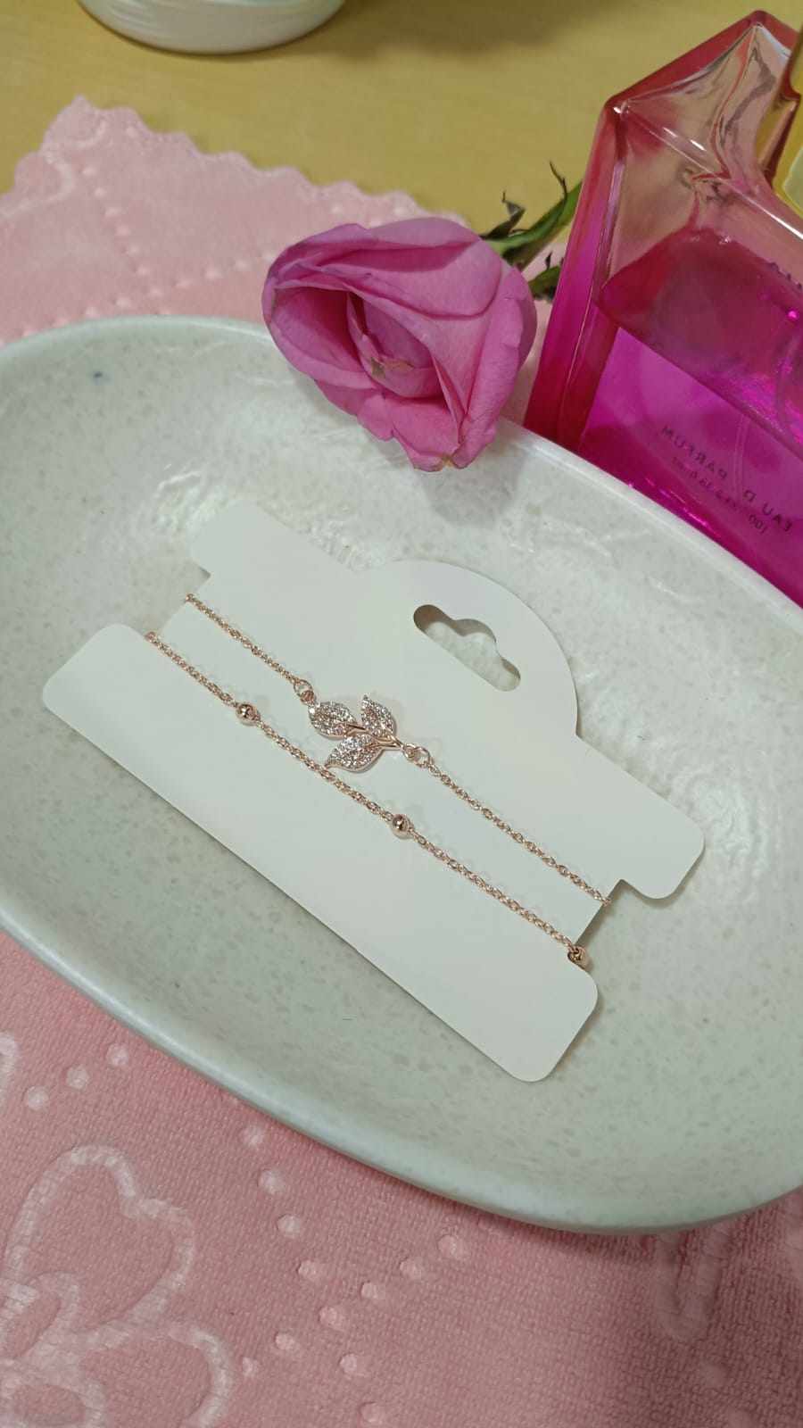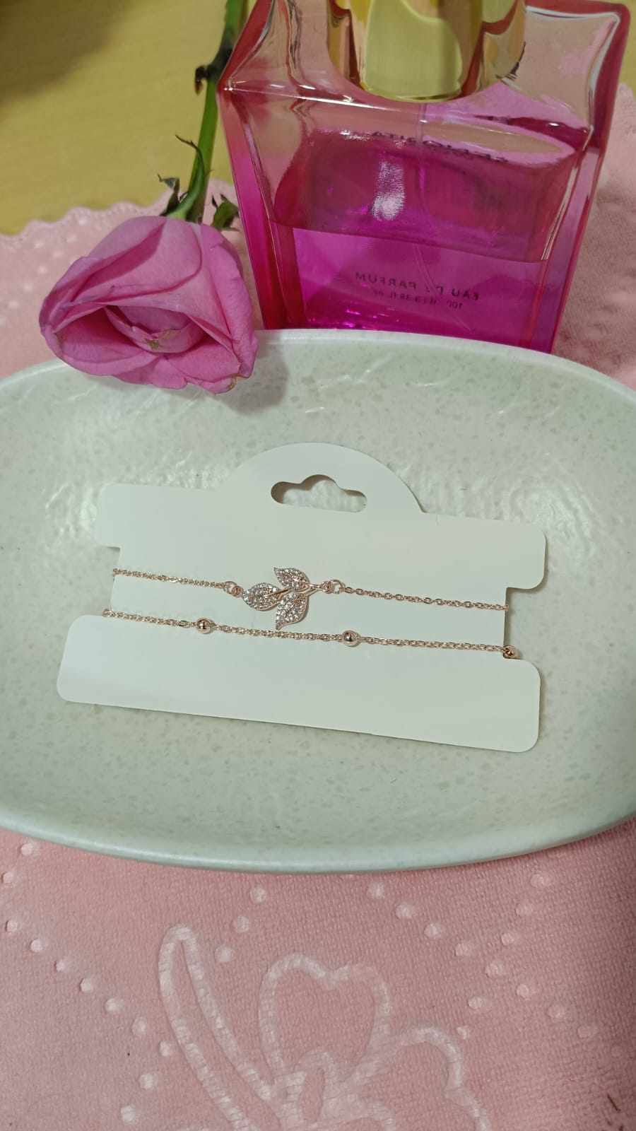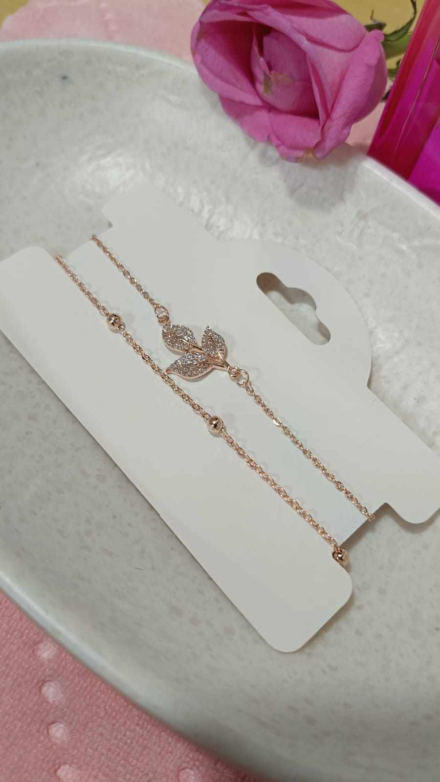 Designed with delicate leaf-inspired charms and a multi-layered chain, this bracelet adds a graceful and feminine touch to any outfit. Finished in radiant rose gold plating, it offers a warm glow that complements all skin tones.